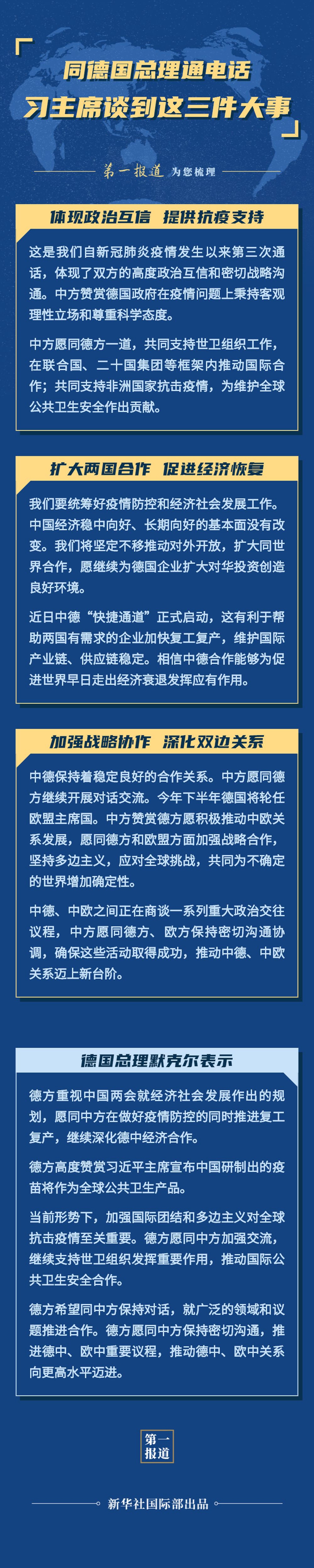 這是自新冠肺炎疫情發(fā)生以來,習主席同默克爾總理第三次通話。通話信息豐富,“第一報道”為您梳理——