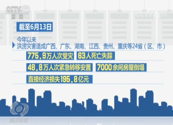 入汛以來,應(yīng)急管理部組織消防救援隊(duì)伍累計(jì)參加抗洪搶險(xiǎn)救援1489余起,出動(dòng)指戰(zhàn)員2萬余人次,營救和疏散轉(zhuǎn)移遇險(xiǎn)群眾21920人。截至6月13日,今年以來洪澇災(zāi)害造成廣西、廣東、湖南、江西、貴州、重慶等24省(區(qū)、市)775.9萬人次受災(zāi),63人死亡失蹤,48.8萬人次緊急轉(zhuǎn)移安置,7000余間房屋倒塌,直接經(jīng)濟(jì)損失195.8億元。在受洪水影響較重的地區(qū),受困群眾的安置是地方政府最重要的工作之一。