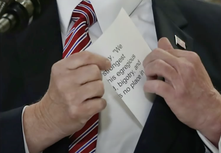 其實當時白宮幕僚已經(jīng)寫好了講稿,照著念即可。媒體不小心拍到了部分講稿上不完整的詞句“最強烈地”“極為嚴重的”“偏執(zhí)”和“在美國沒有市場”,明顯在批評白人至上主義?僧斂偨y(tǒng)特朗普收起講稿的時候,幕僚們都明白,他們又要面對媒體的狂風暴雨了。