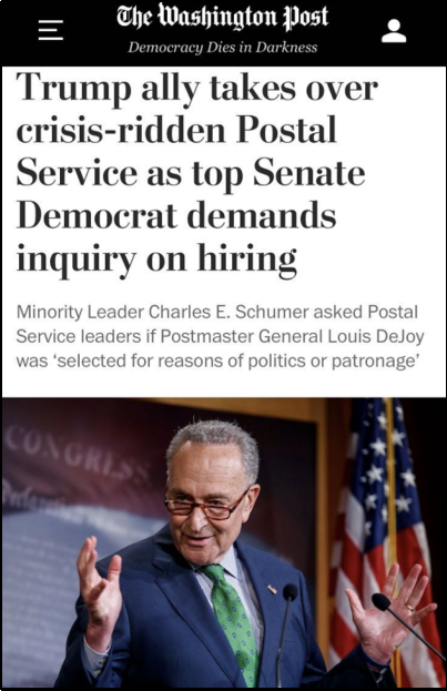 △《華盛頓郵報》報道,民主黨已于6月14日正式要求調(diào)查新郵政局長的任命