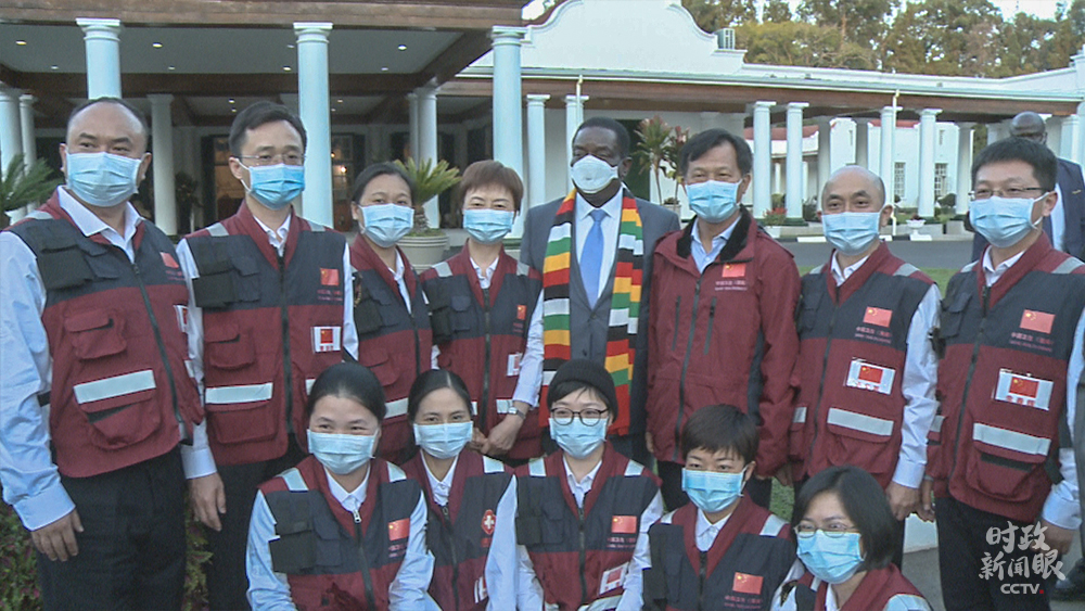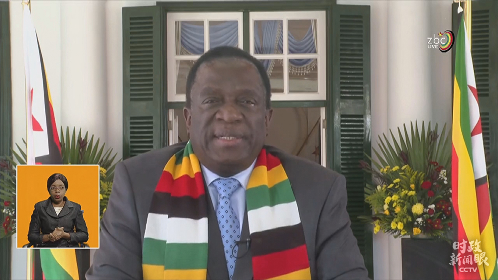 △5月12日,津巴布韋總統(tǒng)姆南加古瓦在總統(tǒng)府接見中國抗疫醫(yī)療專家組,并在國家電視臺(tái)發(fā)表講話時(shí),再次感謝中國幫助津巴布韋抗擊新冠肺炎疫情。(總臺(tái)央視記者馬培敏提供)