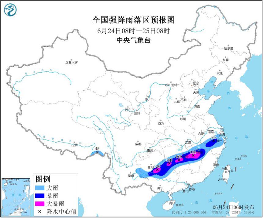 人民網(wǎng)北京6月24日電 中央氣象臺(tái)6月24日06時(shí)繼續(xù)發(fā)布暴雨黃色預(yù)警:預(yù)計(jì),6月24日08時(shí)至25日08時(shí),貴州南部、廣西北部、湖南中部、江西中北部、福建西北部、安徽南部、浙江中北部等地的部分地區(qū)有大到暴雨,其中,貴州東南部、廣西北部、湖南中部、江西中部等地局地有大暴雨(100~180毫米)。上述部分地區(qū)伴有短時(shí)強(qiáng)降水(最大小時(shí)降雨量30~60毫米,局地可超過70毫米),局地有雷暴大風(fēng)等強(qiáng)對流天氣。