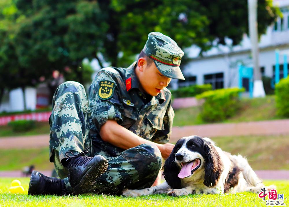警犬訓(xùn)導(dǎo)員與警犬爾杰坐在草地上小憩。廖鍵 攝