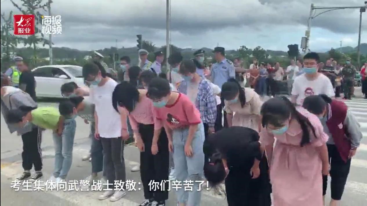 首先,我們來看一段視頻。受洪澇災(zāi)害影響,安徽歙縣高考語文、數(shù)學(xué)科目推遲至7月9日舉行。當(dāng)天下午,考生們走出考場時(shí),向現(xiàn)場保障他們考試的武警黃山支隊(duì)官兵、公安干警等鞠躬致謝:你為我護(hù)航,我向你致敬!