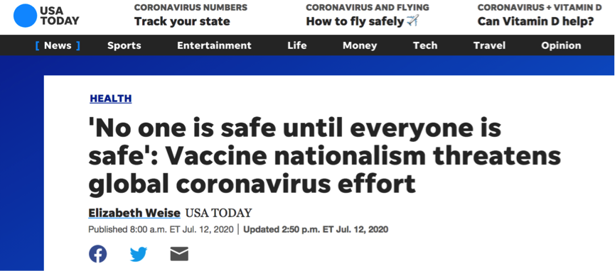 《今日美國》發(fā)文指出,世界卷入了一場混亂的疫苗研發(fā)競賽,這正是公共衛(wèi)生專家擔(dān)心的。為了本國公民獲取足夠的疫苗,“以我為主”的“民族主義”正在加大國家之間的對立,而不是促成廣泛的合作、協(xié)調(diào)和共享。