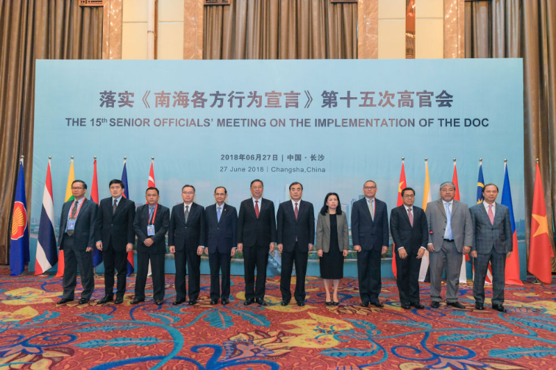 2018年6月25日至27日,中國與東盟國家11國在中國湖南省長沙市舉行落實(shí)《南海各方行為宣言》第15次高官會(huì)和第24次聯(lián)合工作組會(huì)。這是與會(huì)代表合影。新華社發(fā)(張笑宇攝)