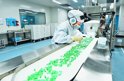 人福普克藥業(yè)(武漢)有限公司,工人在后處理工序生產(chǎn)線工作。高勇攝/光明圖片