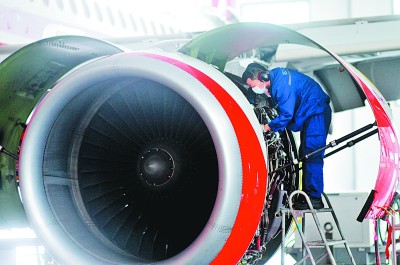 貝迪克凌云(宜昌)飛機維修工程有限公司維修基地,技術人員正在為疫情后接收的首批飛機實施定檢。黃翔攝/光明圖片