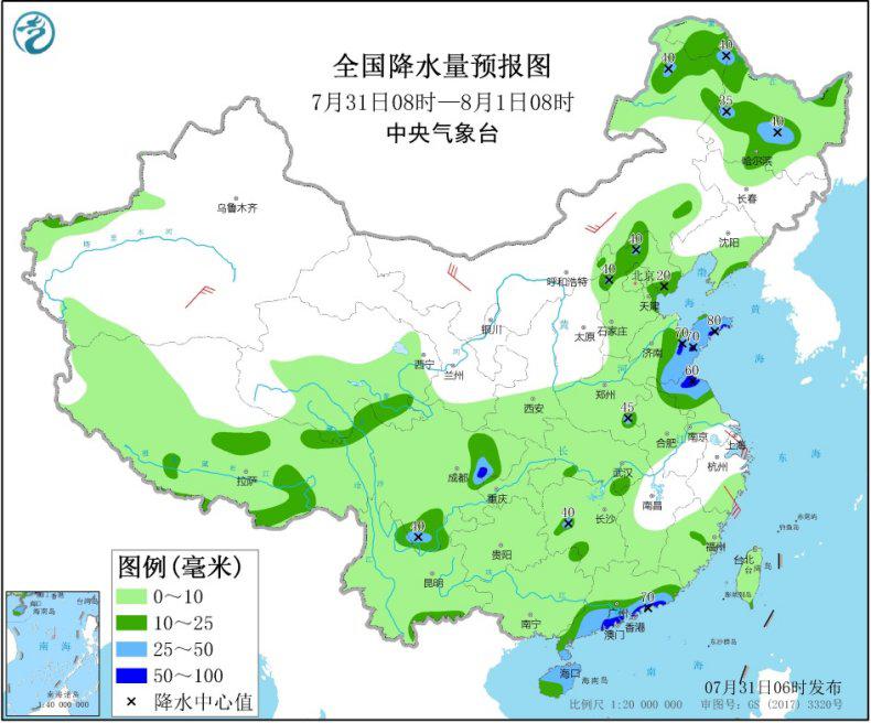 7月31日08時(shí)至8月1日08時(shí),東北地區(qū)北部、華北北部、黃淮、江淮北部以及河南東南部、湖北東南部、湖南西部、四中部和南部、廣東南部沿海、海南、新疆西南部和青藏高原東南部等地的部分地區(qū)有中到大雨,其中,山東中東部、江蘇北部、四川盆地中部、廣東南部沿海等地部分地區(qū)有暴雨(50~80毫米)。內(nèi)蒙古中部和西北部、新疆南疆盆地、江蘇南部、浙江南部等地部分地區(qū)有4~6級及以上風(fēng)(見圖1)。南海北部、瓊州海峽將有6~7級、陣風(fēng)8~9級大風(fēng),南海中部和南部將有6~7級、陣風(fēng)8~9級大風(fēng),部分海域風(fēng)力可達(dá)8級,陣風(fēng)9~10級。