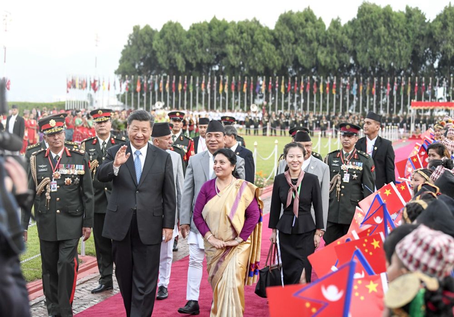 2019年10月12日,國家主席習近平乘專機抵達加德滿都,開始對尼泊爾進行國事訪問。尼泊爾總統(tǒng)班達里在機場為習近平舉行具有濃郁尼泊爾民族特色的歡迎儀式。新華社記者 高潔 攝