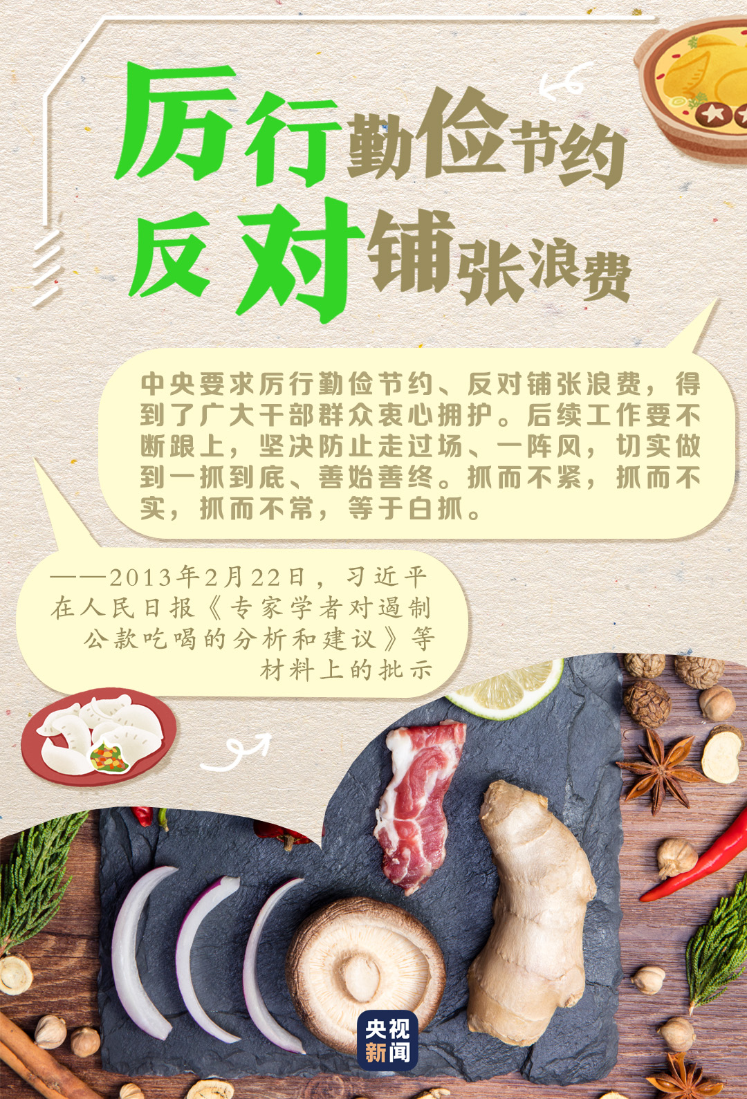 “要采取針對性、操作性、指導性強的舉措,加強監(jiān)督檢查,鼓勵節(jié)約,整治浪費! 2013年1月17日,習近平在新華社《網(wǎng)民呼吁遏制餐飲環(huán)節(jié)“舌尖上的浪費”》的材料上作出批示。