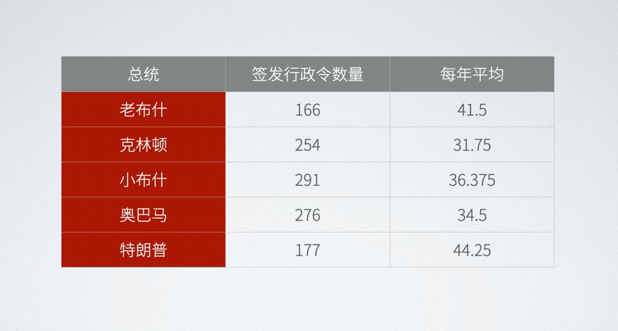 作為行政機構(gòu)重要的權(quán)力,美國歷任總統(tǒng)都在簽發(fā)數(shù)量不少的行政令。羅斯福在位12年里,簽發(fā)了3712項行政令,小布什在8年里發(fā)布了291條行政令。截止到2020年8月8日,特朗普政府一共簽發(fā)了177份行政令,平均下來每年44.25項,多于從1963年肯尼迪以后所有美國總統(tǒng)的平均值。