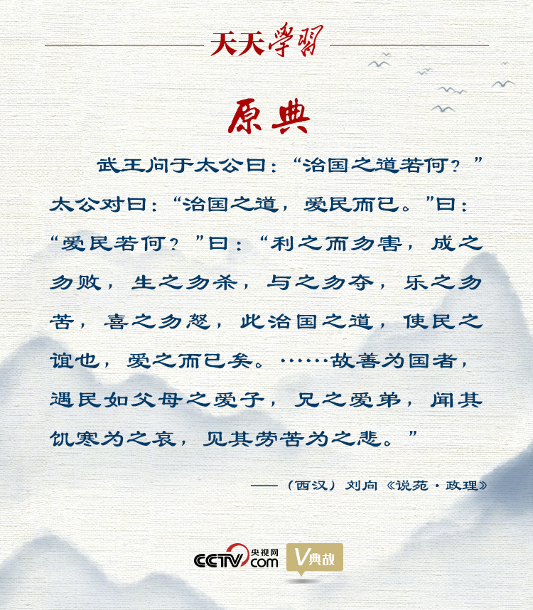 西漢經(jīng)學(xué)家劉向在《說苑·政理》中講述了這樣一個故事:三千多年前,周武王向姜太公詢問治國方法,太公答道:“治國之道,愛民而已。”接著,二人就愛民方式方法問題進(jìn)行了深入探討。最后太公總結(jié)道:“善為國者,遇民如父母之愛子,兄之愛弟,聞其饑寒為之哀,見其勞苦為之悲!睘閲褐卫韲;遇:對待。意思是,善于治理國家的人,對待百姓就像父母愛護(hù)子女、兄長愛護(hù)弟弟一樣,聽到他們挨凍受餓就感到哀傷,看到他們勞苦不堪就感到悲痛!