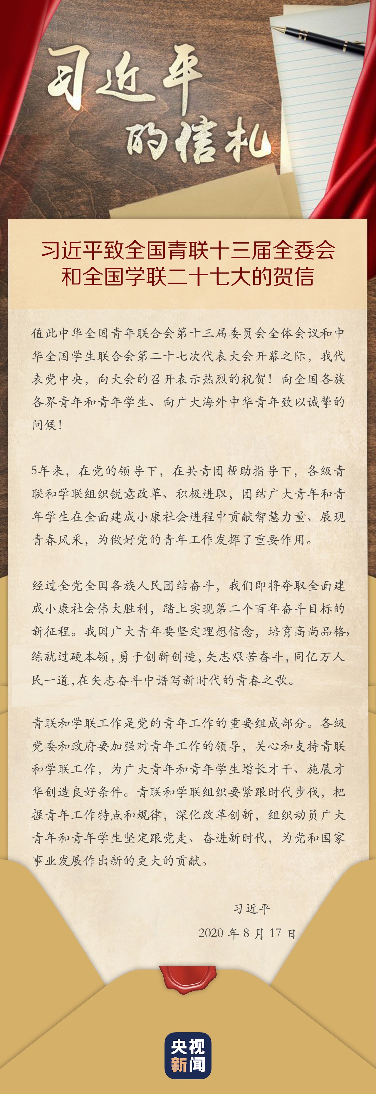 中華全國青年聯(lián)合會第十三屆委員會全體會議、中華全國學生聯(lián)合會第二十七次代表大會8月17日在北京開幕。習近平總書記發(fā)來賀信,代表黨中央,向大會的召開表示熱烈的祝賀,向全國各族各界青年和青年學生、向廣大海外中華青年致以誠摯的問候。