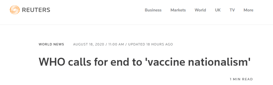目前,全球新冠疫情依然嚴(yán)峻,上百種疫苗進(jìn)入不同的測試階段,有望在不久的將來面世。在此期間,英美等一些發(fā)達(dá)國家與制藥企業(yè)簽訂協(xié)議,以保證本國疫苗優(yōu)先供應(yīng)。批評人士稱,這種“本國優(yōu)先”的做法正在助長“疫苗民族主義”風(fēng)氣,導(dǎo)致富裕國家爭相囤積新冠疫苗,而貧窮國家卻一劑難求。
