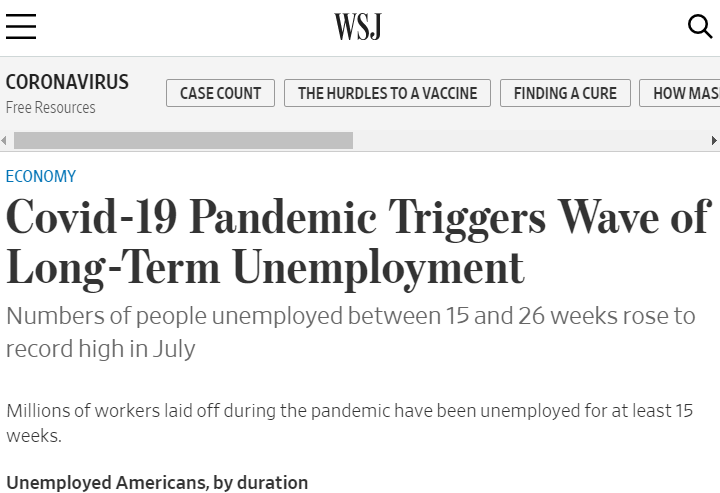 △《華爾街日報》稱,新冠肺炎疫情引發(fā)長期失業(yè)浪潮,7月美國失業(yè)15至26周的人數(shù)創(chuàng)紀(jì)錄