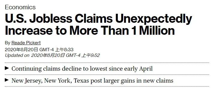 美國(guó)勞工部發(fā)布的數(shù)據(jù)則顯示,截至8月15日的一周,美國(guó)首次申請(qǐng)失業(yè)救濟(jì)人數(shù)再度突破100萬(wàn)關(guān)口。美國(guó)就業(yè)市場(chǎng)復(fù)蘇依然步履蹣跚。