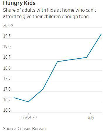 △美國(guó)人口普查局的數(shù)據(jù)顯示,負(fù)擔(dān)不起給孩子提供足夠食物的美國(guó)家長(zhǎng)比例持續(xù)上升,7月底已經(jīng)接近20%。