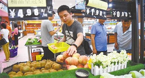 洋縣蔚藍(lán)超市,顧客正在選購柳山村供應(yīng)的果蔬。目前,該村共種植油桃、獼猴桃1500多畝,年產(chǎn)值300多萬元。