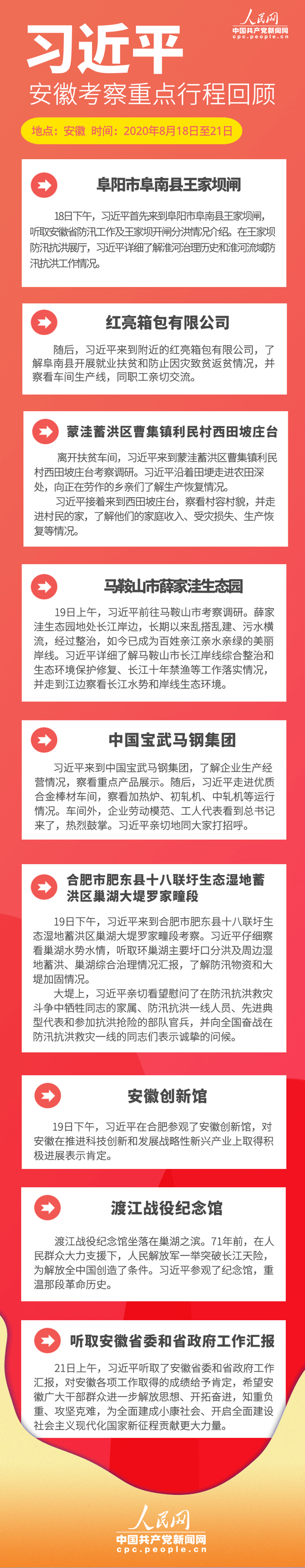 8月18日至21日,習(xí)近平來到安徽,看望慰問受災(zāi)群眾和防汛救災(zāi)一線人員,就統(tǒng)籌推進常態(tài)化疫情防控和經(jīng)濟社會發(fā)展工作、加強防汛救災(zāi)和災(zāi)后恢復(fù)重建、推進長三角一體化發(fā)展、謀劃“十四五”時期經(jīng)濟社會發(fā)展進行調(diào)研。