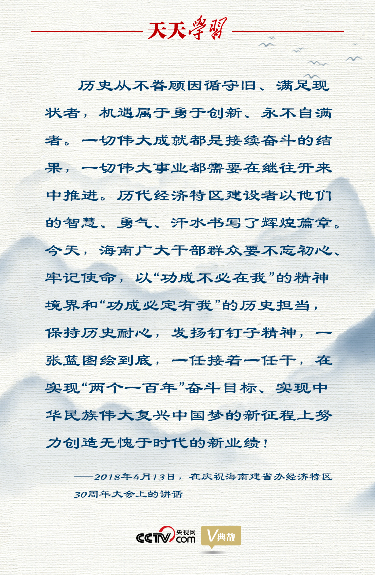 2018年4月13日,在慶祝海南建省辦經濟特區(qū)30周年大會上,習近平總書記充分肯定經濟特區(qū)建設的歷史功績,深刻總結經濟特區(qū)建設的寶貴經驗,提出在新時代新起點上繼續(xù)把全面深化改革推向前進,強調要以“功成不必在我”的精神境界和“功成必定有我”的歷史擔當,保持歷史耐心,發(fā)揚釘釘子精神,一張藍圖繪到底,一任接著一任干,為新時代進一步辦好經濟特區(qū)指明了前進方向、提供了根本遵循。