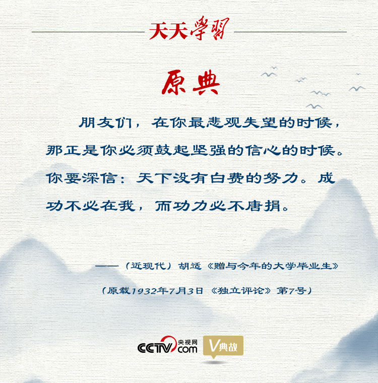 “功成不必在我”“功成必定有我”出自1932年胡適在北大畢業(yè)典禮上的講話《贈與今年的大學畢業(yè)生》,原文為“成功不必在我,而功力必不唐捐”。