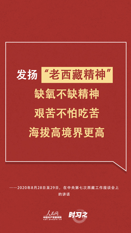 “缺氧不缺精神、艱苦不怕吃苦、海拔高境界更高,在工作中不斷增強責任感、使命感,增強能力、錘煉作風!绷暯皆谧剷显俅螢榘l(fā)揚“老西藏精神”作出注解。同時,習近平也提出要關(guān)心愛護西藏干部職工,完善好、落實好工資收入、住房、就醫(yī)、子女入學、退休安置等各方面支持政策,重視健康保障工作。