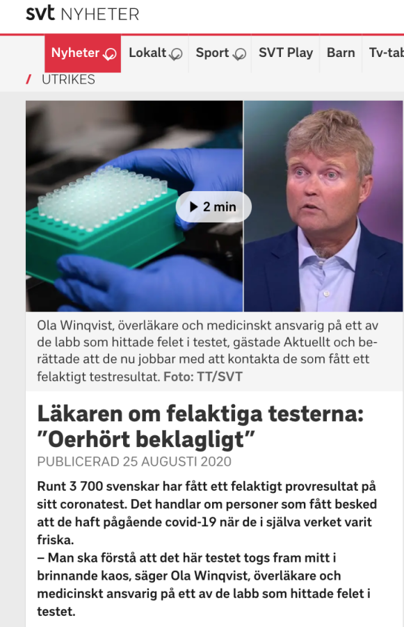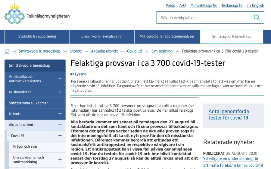 8月27日,瑞典公共衛(wèi)生局在其網(wǎng)站上發(fā)布了一篇文章《錯(cuò)誤的測(cè)試結(jié)果導(dǎo)致大約3700個(gè)新冠肺炎確診數(shù)據(jù)》。