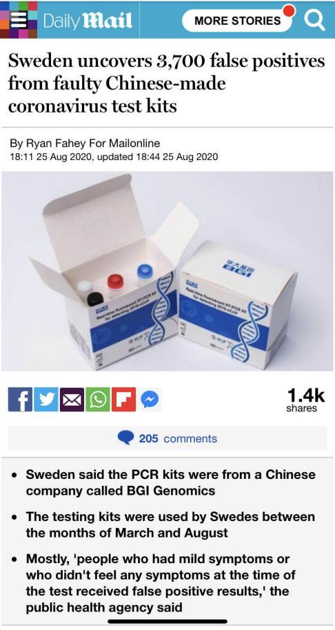 △英國每日郵報(bào) “瑞典從中國產(chǎn)的檢測(cè)試劑盒中查出3700例假陽性”