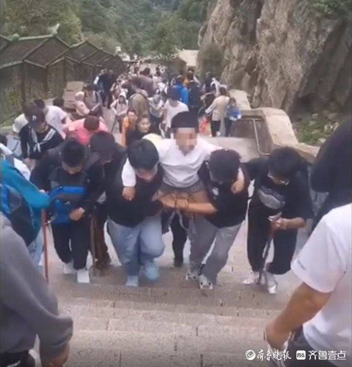 這件事情發(fā)生在8月26日,五名來自山東棗莊滕州的高中生,在攀登泰山途中遇到了一位背著孩子的母親,經過詢問得知孩子在爬山過程中突發(fā)頭暈胸悶、惡心脫力,這位母親背著一路上已用盡了全部力氣。得知情況后,五位少年互相看了一眼,沒有任何猶豫,決定將孩子抬到南天門紅十字救助站。要知道,當時他們正處在泰山登山盤路中最險要的一段,俗稱“緊十八”,傾角70至80度,在不足1公里的距離內升高400米,攀登起來十分費力,五個男生就用“抬轎子”的方式將孩子送到了救助點。