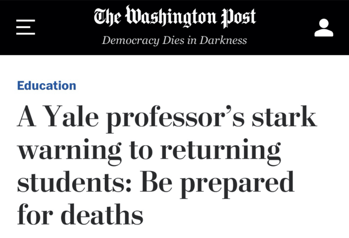 當(dāng)耶魯大學(xué)宣布打算在秋季學(xué)期重啟線下教學(xué)時,該校心理學(xué)教授勞里·桑托斯對學(xué)生們發(fā)出預(yù)警:返?赡軙䦷怼吧镭P(guān)的后果”。
