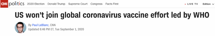對此,CNN評論稱,特朗普政府在美國確診病例超過600萬的關(guān)鍵時刻作出這一決定,將使美國孤立于參與“新冠肺炎疫苗實(shí)施計(jì)劃(COVAX)”的170多個國家之外。