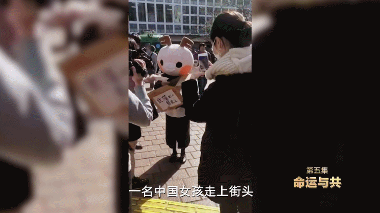 大約20天之后,還是在日本東京,一名中國女孩走上街頭,頭戴玩偶頭套,向路過的市民分發(fā)口罩。她手捧的紙箱上寫著“來自武漢的報恩”的日語字樣。