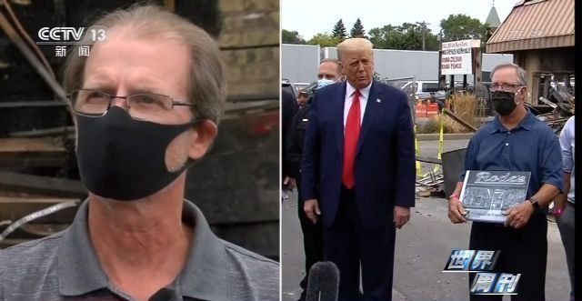 9月1日,在一片廢墟前,特朗普對商鋪被燒毀的攝影器材店老板羅德表示慰問,并對基諾沙市市長和威斯康星州州長大加指責(zé),批評這兩位民主黨人沒有在第一時間派遣國民警衛(wèi)隊維護治安。