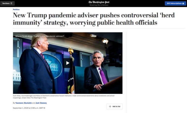 據(jù)《華盛頓郵報》報道,放松檢測的主意來自于上個月新上任的白宮新冠小組成員阿特拉斯。阿特拉斯此前是斯坦福大學(xué)醫(yī)學(xué)中心神經(jīng)放射科主任,并非傳染病學(xué)專家,但他積極主張復(fù)工、復(fù)課以及群體免疫等概念,與特朗普觀點一致。