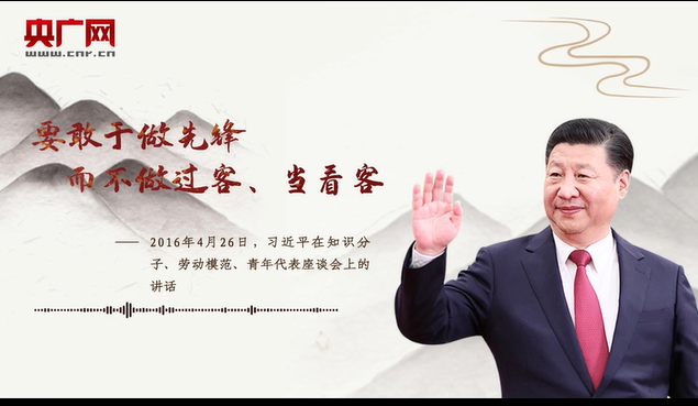 習(xí)近平:要敢于做先鋒,而不做過客、當(dāng)看客,讓創(chuàng)新成為青春遠航的動力,讓創(chuàng)業(yè)成為青春搏擊的能量,讓青春年華在為國家、為人民的奉獻中煥發(fā)出絢麗光彩。