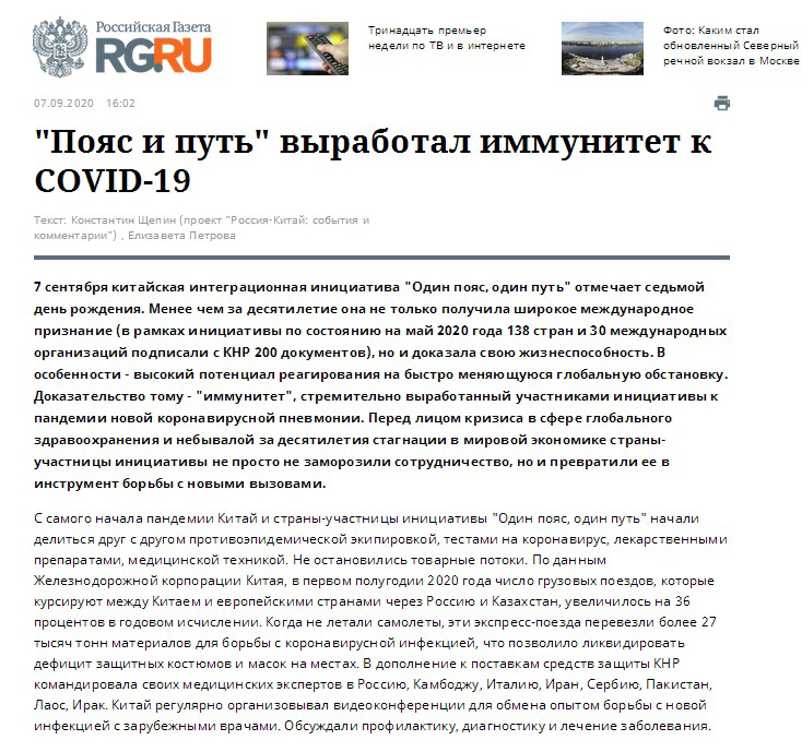 當(dāng)?shù)貢r(shí)間9月7日,《俄羅斯報(bào)》網(wǎng)站在《中俄銳評(píng)》專欄刊發(fā)題為《“一帶一路”賦能全球抗疫》的評(píng)論文章。文章稱,9月7日適逢中國提出“一帶一路”倡議七周年。7年來,該倡議得到138個(gè)國家和30個(gè)國際組織的支持與信任,在應(yīng)對(duì)全球挑戰(zhàn)方面展示出強(qiáng)大生命力。面對(duì)新冠肺炎疫情導(dǎo)致的全球公共衛(wèi)生危機(jī)以及世界經(jīng)濟(jì)蕭條這一前所未有的局面,“一帶一路”沿線國家不僅繼續(xù)保持框架內(nèi)的經(jīng)濟(jì)和項(xiàng)目合作,還特別加強(qiáng)抗疫協(xié)作,共同應(yīng)對(duì)全球挑戰(zhàn)。