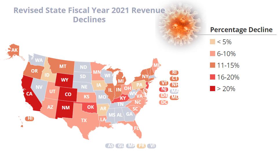 美國從3月中旬宣布進(jìn)入國家緊急狀態(tài)已經(jīng)近半年,各地的疫情危機(jī)還未過去,又迎來了一場(chǎng)新危機(jī)——多地政府已入不敷出,難以為繼。根據(jù)美國“全國州議會(huì)會(huì)議(NCSL)”已掌握的數(shù)據(jù),近70%的州2021財(cái)政年度的收入將直線下降。其中,美國第一經(jīng)濟(jì)大州加州的財(cái)政收入下跌可能超過20%。