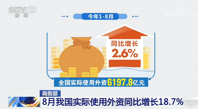 數據顯示,今年1到8月,全國實際使用外資6197.8億元,同比增長2.6%。8月當月,全國實際使用外資841.3億元,同比增長18.7%。