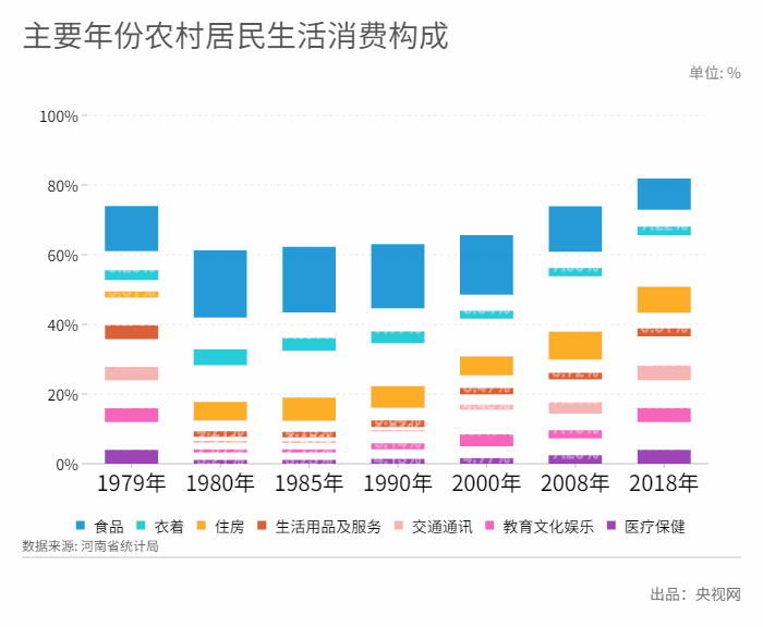 黨的十一屆三中全會(huì)以后,河南農(nóng)村居民收入水平迅速提高,生活消費(fèi)狀況很快得到根本改善。2018年,全省農(nóng)村居民人均生活消費(fèi)支出提高到10392元,是1949年的272.8倍,年均增長8.5%;是1978年的127.2倍,年均增長12.9%。