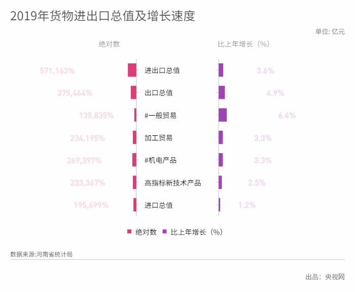 2019年,河南省貨物進(jìn)出口總值5711.63億元,比上年增長3.6%。其中,出口總值3754.64億元,增長4.9%;進(jìn)口總值1956.99億元,增長1.2%。