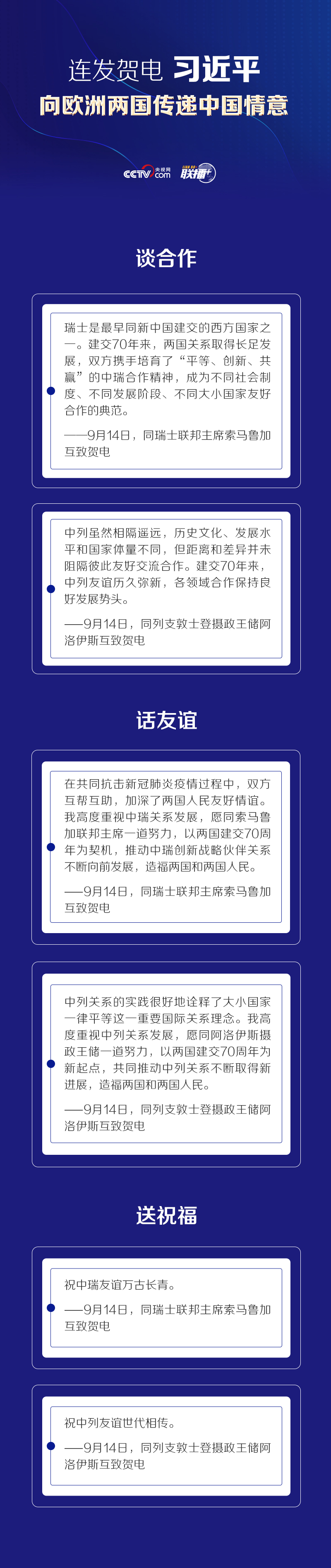 聯(lián)播+9月14日,習(xí)近平主席就中瑞、中列建交70周年,分別同瑞士聯(lián)邦主席索馬魯加、列支敦士登攝政王儲阿洛伊斯互致賀電。