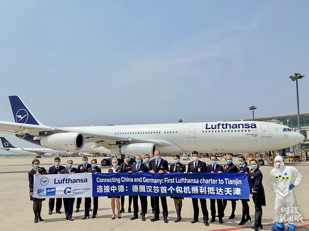 △5月30日,德國(guó)漢莎航空LH342航班承運(yùn)約200名德國(guó)企業(yè)家、技術(shù)專(zhuān)家等旅客,自法蘭克福飛抵天津。這是中德之間的首班復(fù)工包機(jī),兩國(guó)間的“快捷通道”得以實(shí)現(xiàn)。