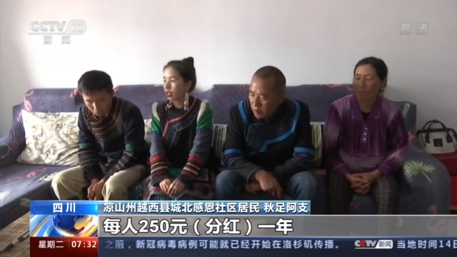 四川涼山州越西縣城北感恩社區(qū)居民 秋足阿支:前三年我們是每戶每人250元(分紅)一年,然后后面每年就是每戶每人1500元一年(分紅)。
