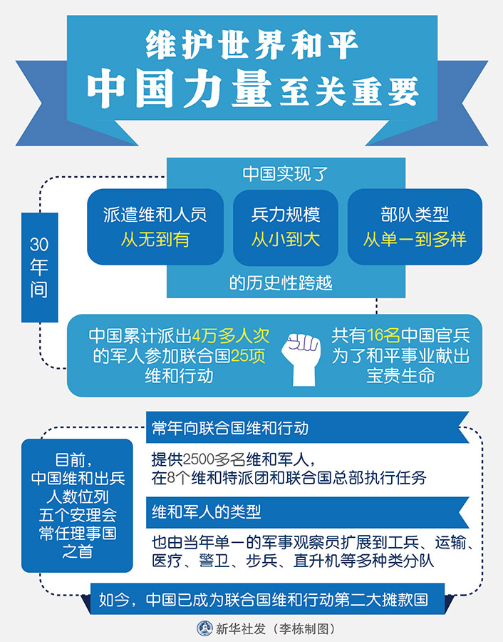 30年間,中國(guó)實(shí)現(xiàn)了派遣維和人員從無(wú)到有、兵力規(guī)模從小到大、部隊(duì)類型從單一到多樣的歷史性跨越。30年間,中國(guó)累計(jì)派出4萬(wàn)多人次的軍人參加聯(lián)合國(guó)25項(xiàng)維和行動(dòng),共有16名中國(guó)官兵為了和平事業(yè)獻(xiàn)出寶貴生命。他們,都擁有一個(gè)共同的名字:“中國(guó)藍(lán)盔”。