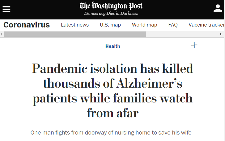 △《華盛頓郵報(bào)》稱,疫情隔離措施已使成千上萬名阿爾茨海默癥患者喪生,家屬卻只能袖手旁觀。