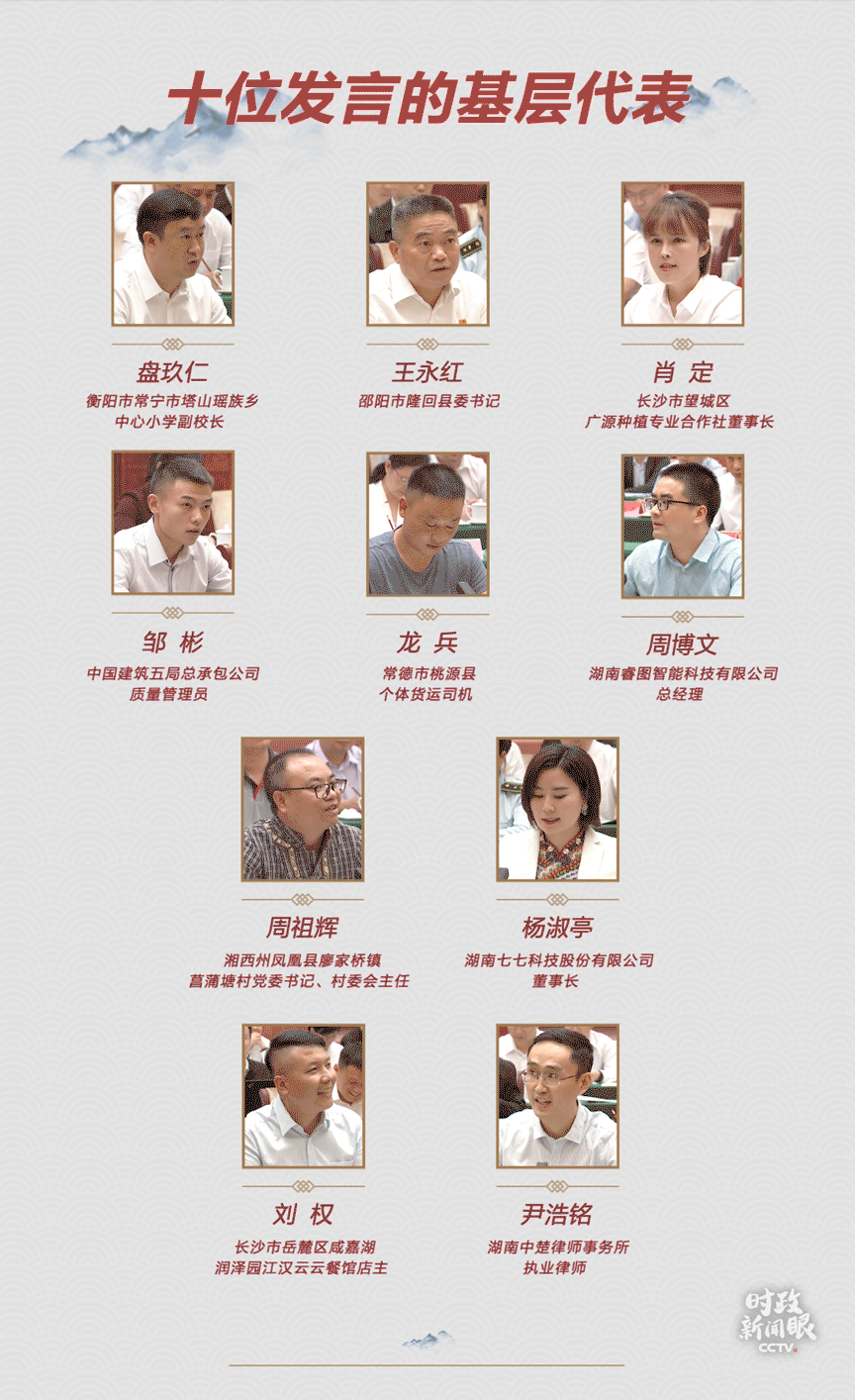 座談會(huì)上,有10位基層干部群眾代表作了發(fā)言。他們來(lái)自湖南省內(nèi)的多個(gè)領(lǐng)域。