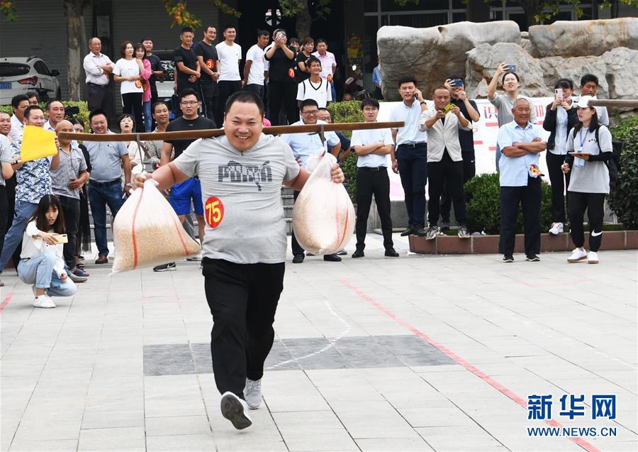 9月21日,山東省棗莊市山亭區(qū)的村民在趣味運(yùn)動會上進(jìn)行挑糧比賽。 9月22日是第三個中國農(nóng)民豐收節(jié),多地舉辦形式多樣的活動迎接豐收節(jié)。 新華社發(fā)(李宗憲 攝)