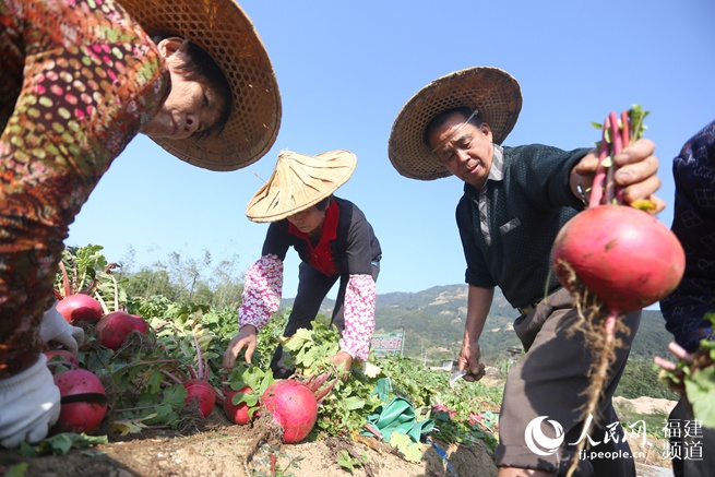 基地不僅種了本地的大白蘿卜,還結(jié)合觀光旅游,引進(jìn)櫻桃蘿卜、美人心蘿卜等新品種。2019年11月底,黃棗村還舉辦了華安縣第一屆多彩蘿卜節(jié)。集生產(chǎn)加工、旅游觀光、自助采摘于一體的蘿卜扶貧產(chǎn)業(yè)基地吸引了不少游客前來,效益初步顯現(xiàn)。