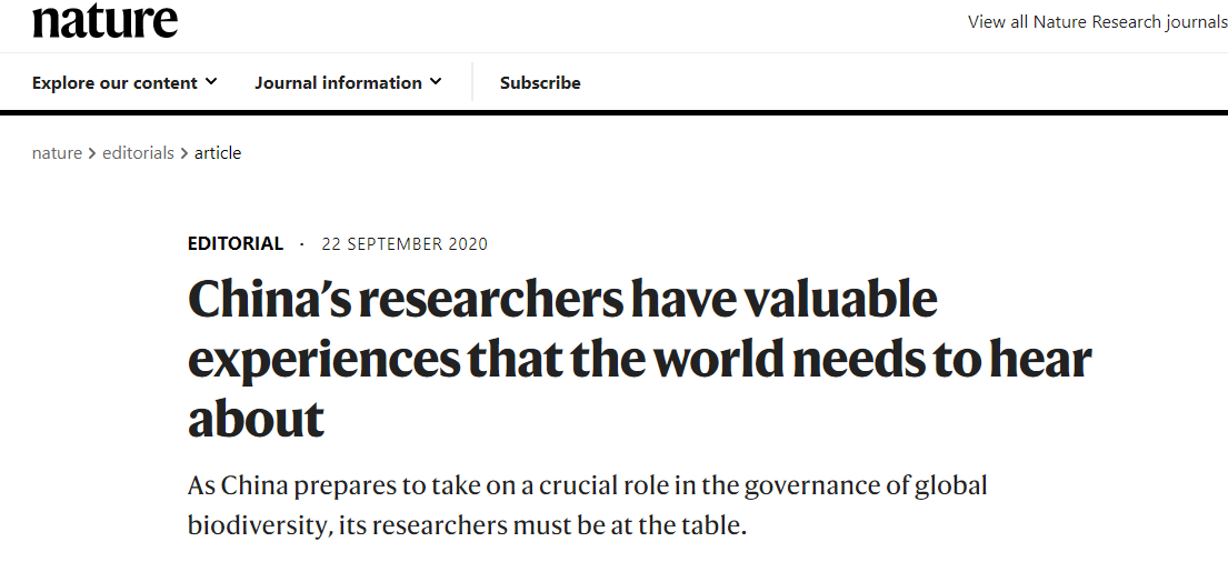 9月23日,英國《自然》雜志發(fā)表社論認為,中國在全球生物多樣性治理中發(fā)揮著關鍵作用,中國科學家有值得全世界傾聽的寶貴經(jīng)驗。